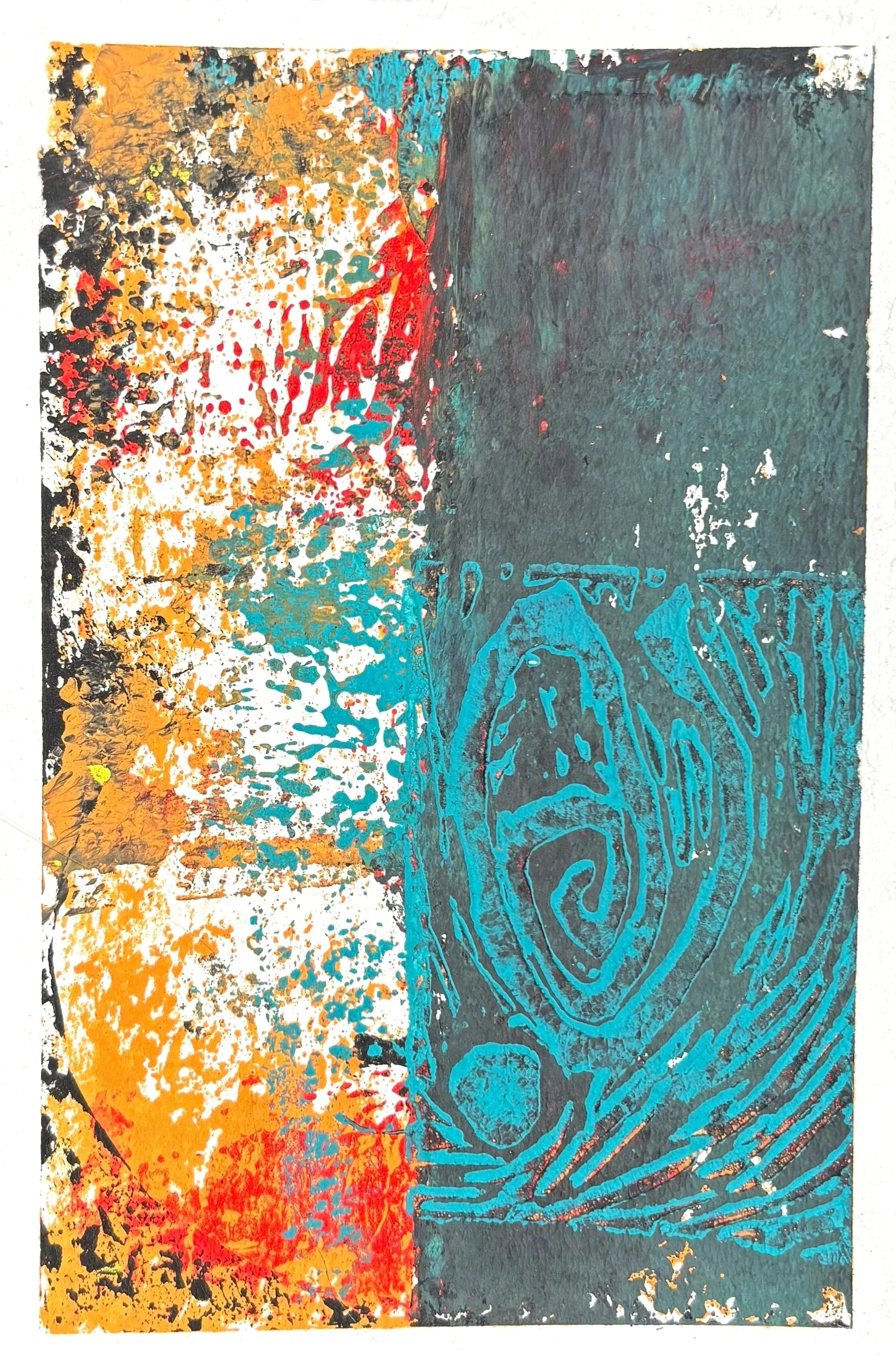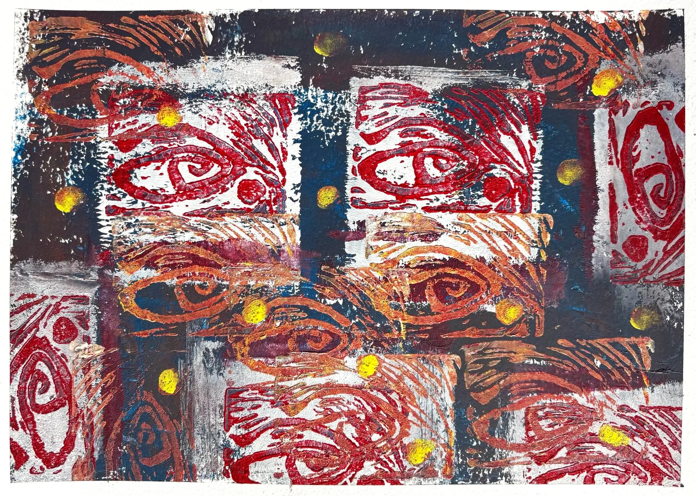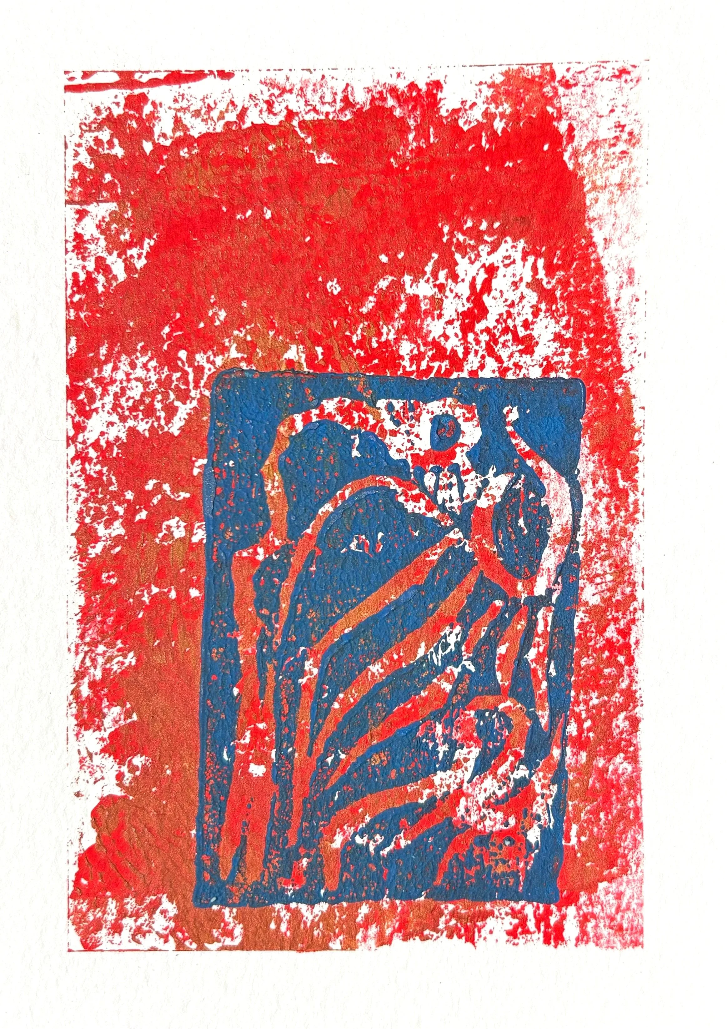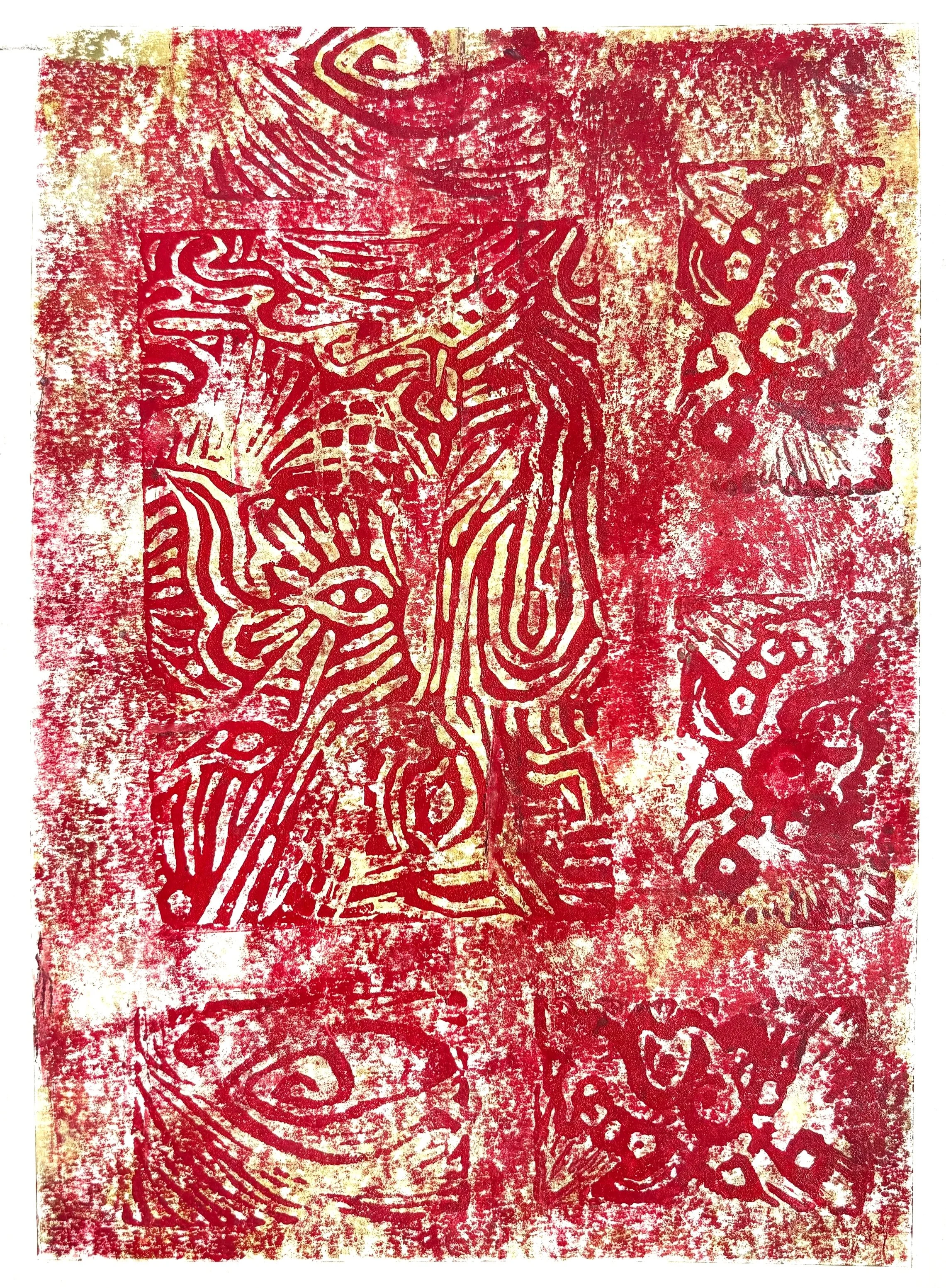 Like my other artworks, my prints emerge through an intuitive process. Working with carved linoleum blocks and layers of color, I follow what wants to come through. Sometimes repeating a form, sometimes letting it transform entirely. This is a new medium for me and I am excited to explore it more! I feel like a child when working with printmaking, a playful practice where accidents become the best part of the final work.