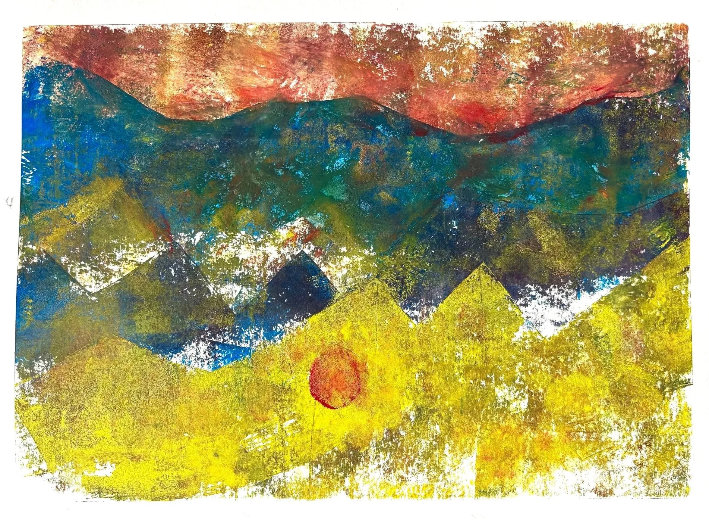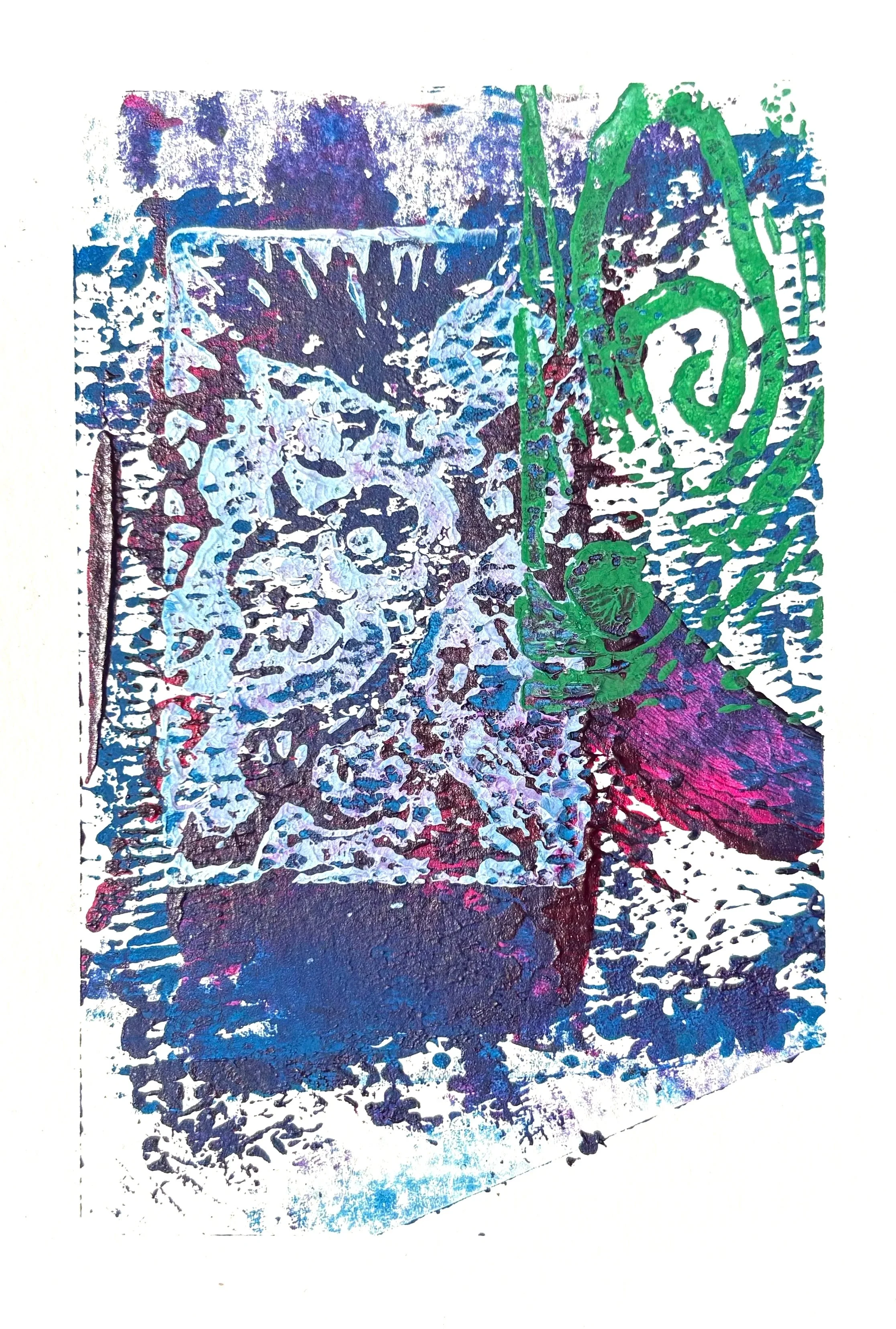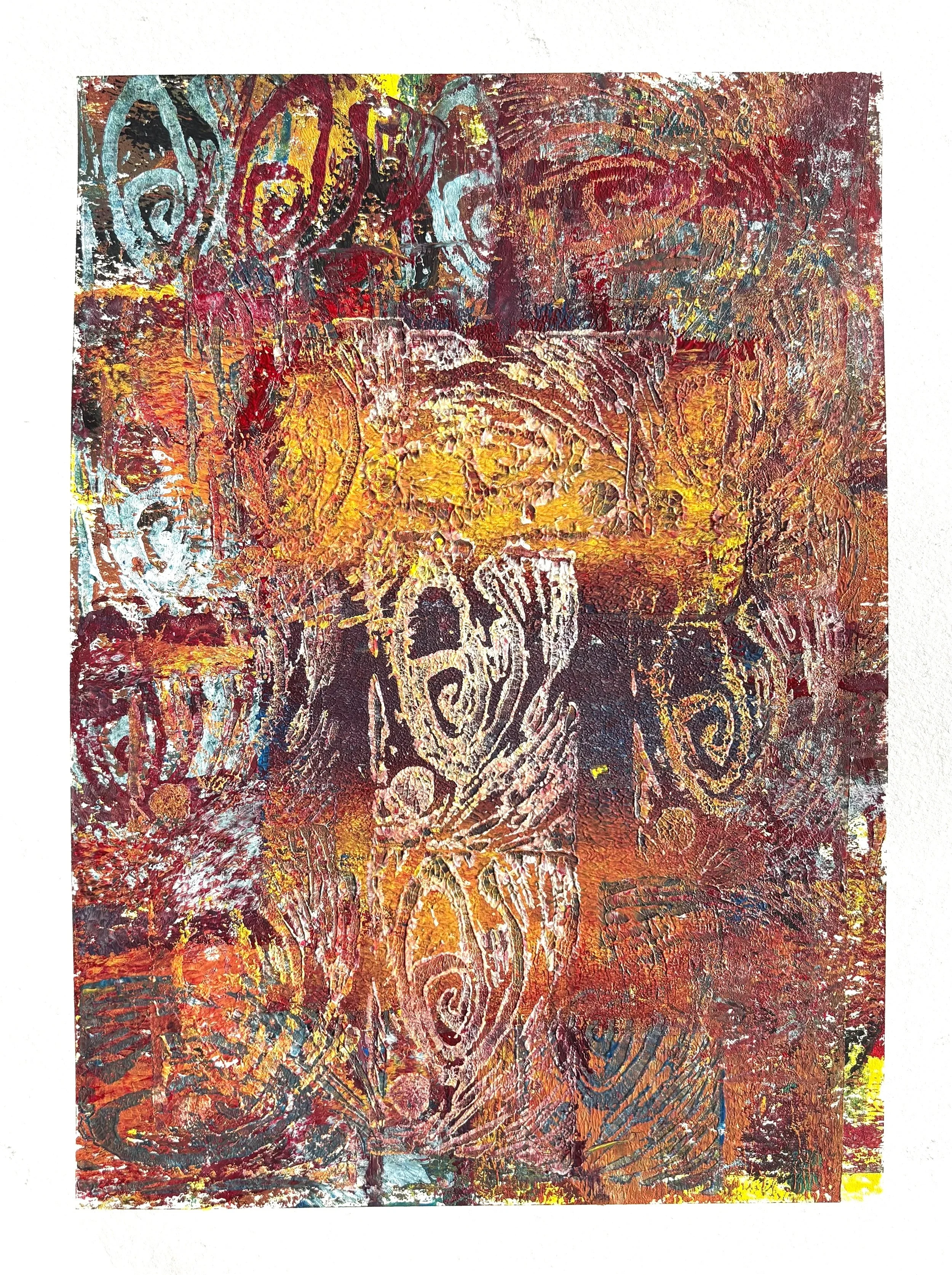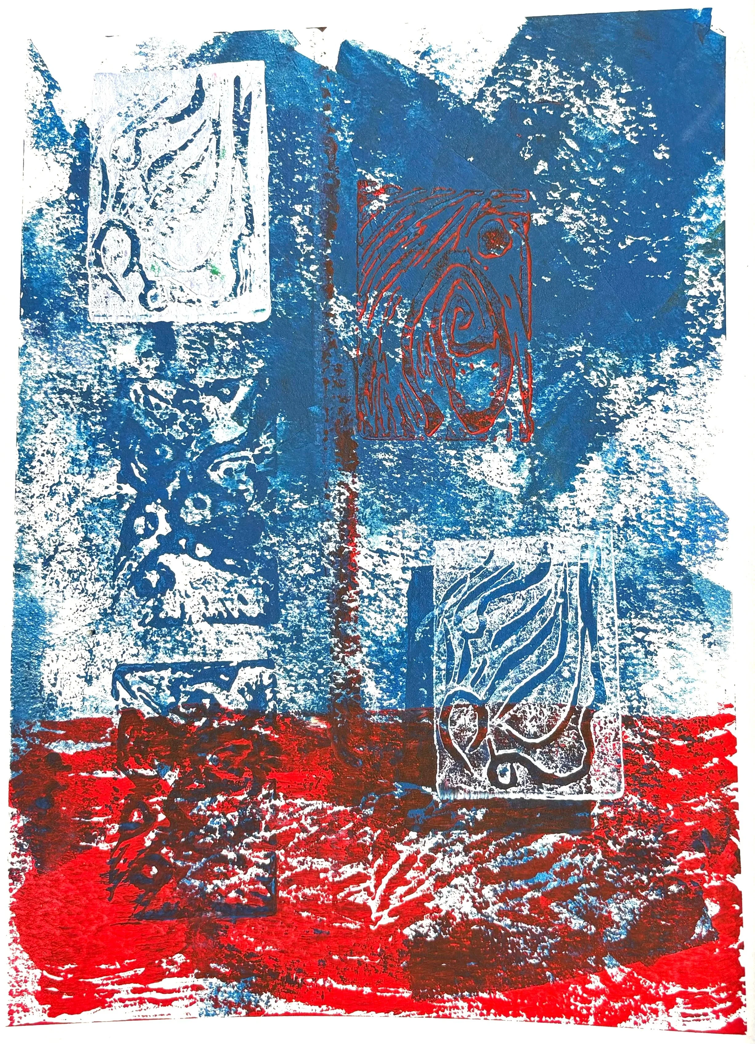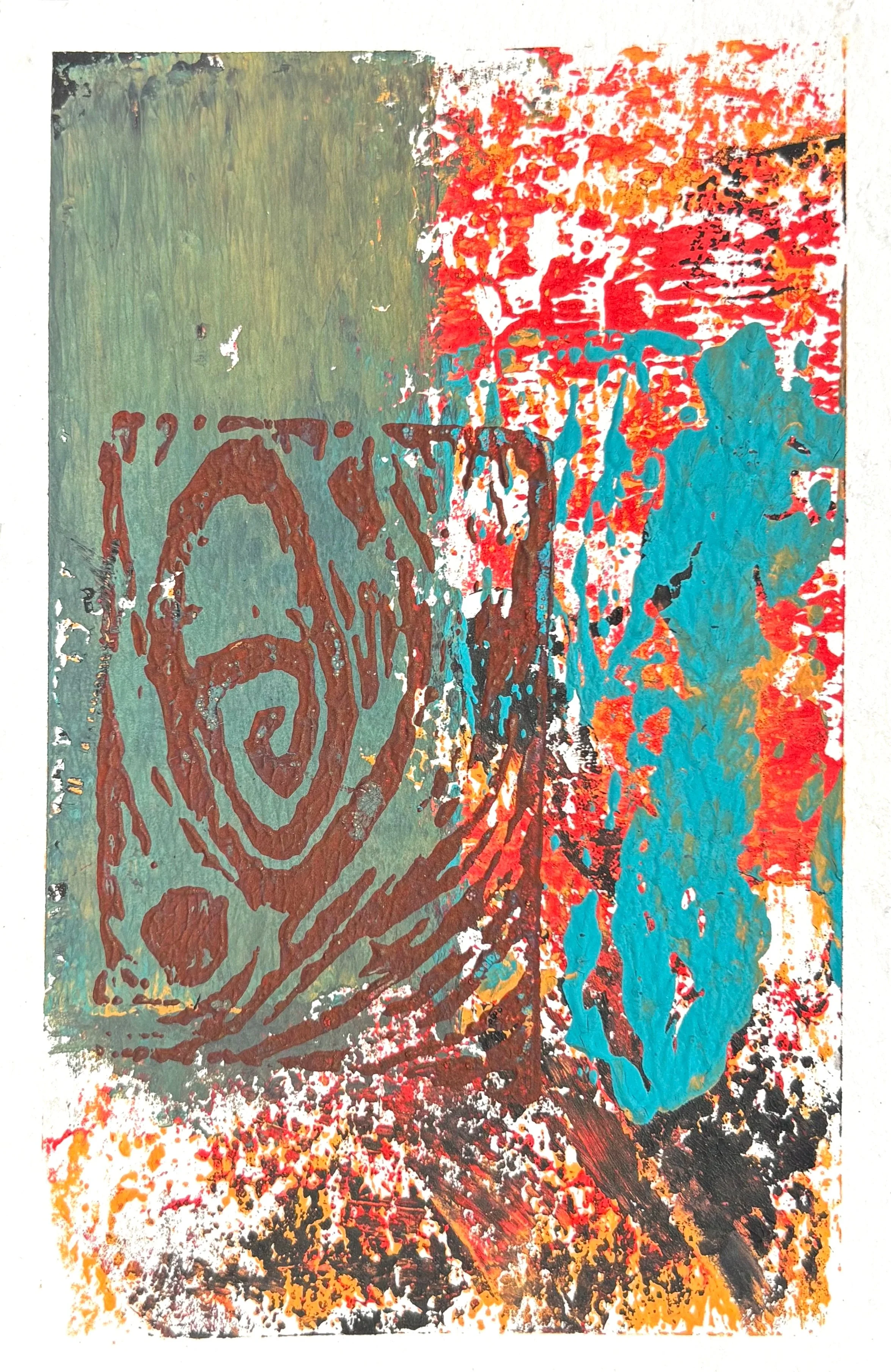 Like my other artworks, my prints emerge through an intuitive process. Working with carved linoleum blocks and layers of color, I follow what wants to come through. Sometimes repeating a form, sometimes letting it transform entirely. This is a new medium for me and I am excited to explore it more! I feel like a child when working with printmaking, a playful practice where accidents become the best part of the final work.